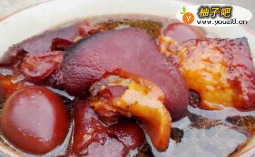 4加上盖子焖煮,同时准备几个煮鸡蛋,剥皮后,放入姜醋中一起煮,差不多焖煮了一个小时的时间,看到锅中的汤汁变得比较浓稠,用筷子扎一下猪脚,可以轻松扎透。