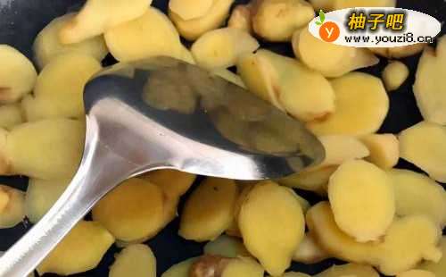 2小黄姜清洗干净,直接切成片,不需要去皮,锅中无需添油,直接放入姜片,小火煸炒一会,慢慢将姜的水分煸出并且蒸发,待看到姜的表面微微焦黄的时候。