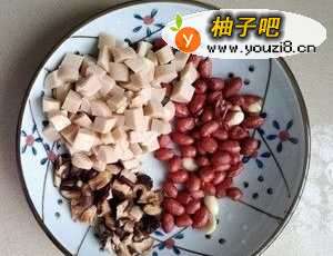2火腿肠、香菇洗干净,切丁。(香菇用冷水洗一遍,再用热水泡一会)花生洗干净。
