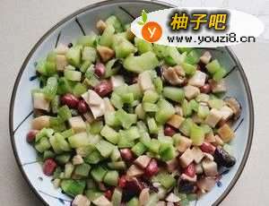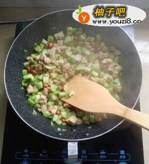 3锅下油,油热后,下大蒜爆香。下黄瓜粒炒一会,再放香菇入味炒。翻炒后加花生米、火腿丁。全部混合翻炒,快熟时加盐即可。