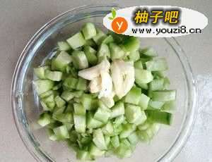 黄瓜削皮洗干净,切小粒。两瓣大蒜拍扁。