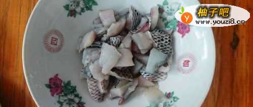 先将鱼处理干净然后片成片状,再切成小丁(这里对鱼的品种没有要求,只要是刺少的鱼都可以),倒入料酒,酱油和生粉,搅拌均匀后腌制15分钟。