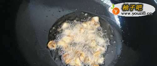 5锅中倒多一点的油,把腌好的鱼丁放下去炸至焦黄后捞出控油。