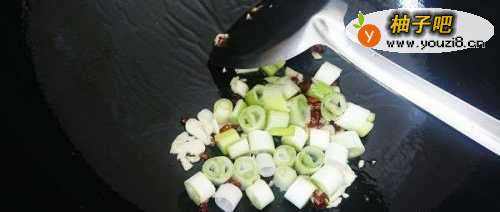 6锅内留少许底油,放入花椒,辣椒和蒜末煸香。