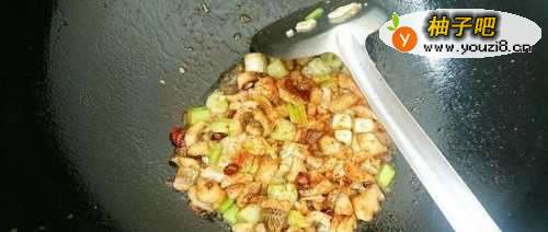 7倒入葱段炒至略软,放入刚才炸好的鱼丁,翻炒两下。