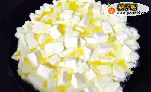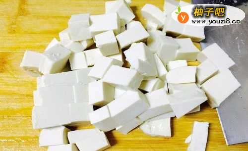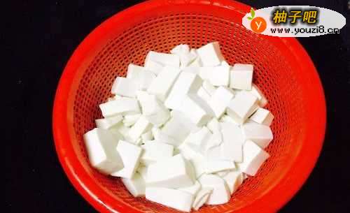 首先把豆腐清洗干净之后切成正方形的小丁状,然后与冷水一起下锅,撒上一点盐,开大火烧开。此步骤是为了取出豆腐的豆腥味以及让豆腐在制作过程中不容易碎!