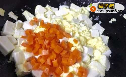5蛋液都凝固之后,把胡萝卜丁倒进去,继续轻轻的翻炒,这时候豆腐会稍微出水,如果加的是火腿肠就不需要额外加水了,我加的是胡萝卜丁,所以加了半碗水,盖上锅盖焖煮一下!