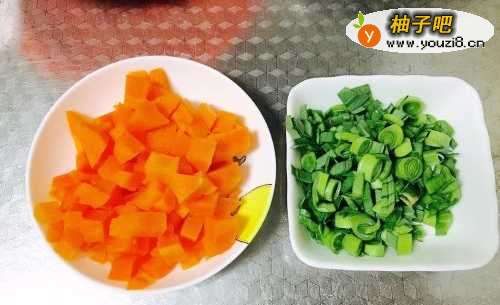 3接下来把胡萝卜切成丁,葱花切好备用。胡萝卜丁也可以换成火腿肠丁,味道都不会差!
