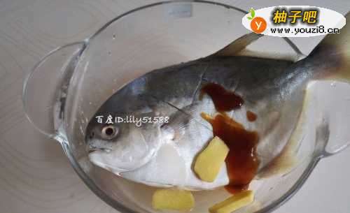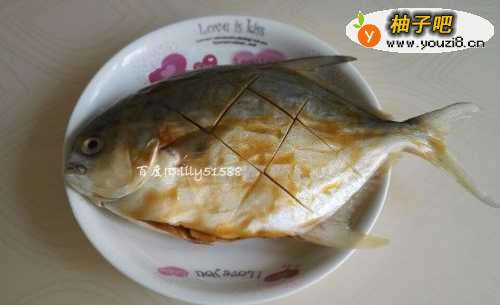 2在金昌鱼身上的两面分别划上几个花刀,放入料酒、盐、姜片腌制十分钟。