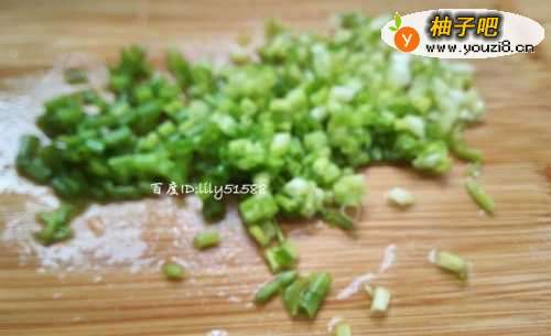 3准备好一些小葱叶,只要绿色的部分切成小段备用。
