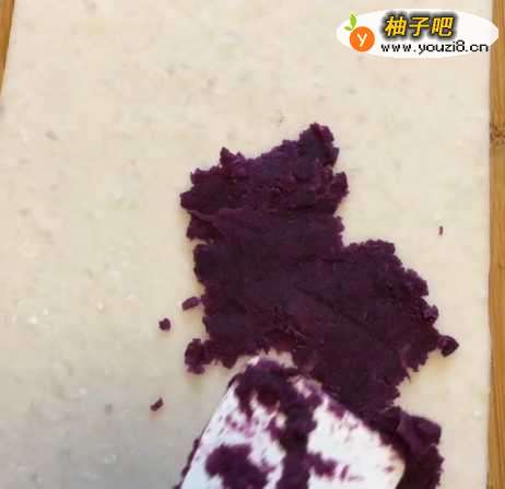 4干成薄片,铺上搅拌好的紫薯泥;
