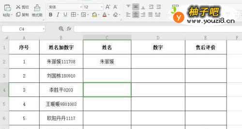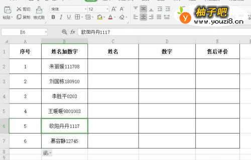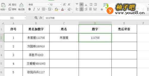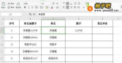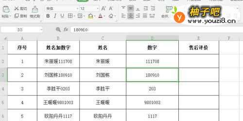 6“数字”列同“姓名”列操作一样,这样就把姓名和数字分开了