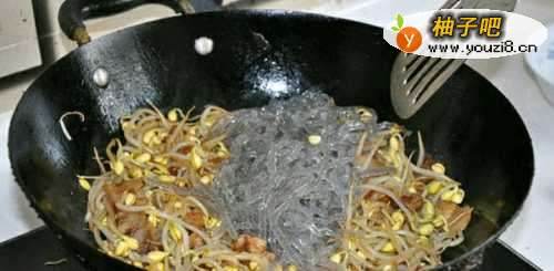 5放入黄豆芽、粉条,加调料,盐、酱油、白糖、五香粉等
