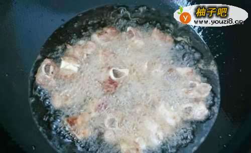 3热锅倒油,油温七成热时,我们倒入刚才焯好的排骨,炸至表面微焦后捞出。