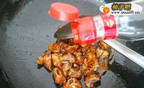 5淋入1汤匙老抽增色,再倒入2汤匙香醋调味,把刚才焯排骨的水倒进锅中,(差不过和排骨齐平的量,一定要用上层比较干净的汤,下面有渣渣的就不要用了)盖上盖子,中火煮15分钟。