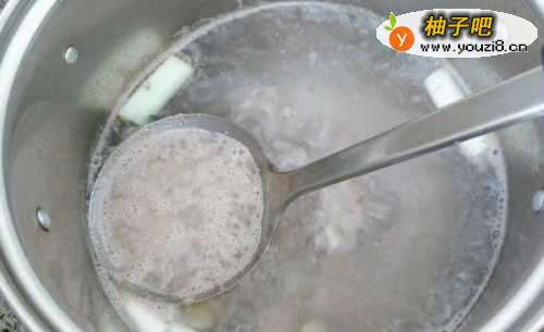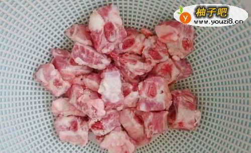 2锅中注入冷水,放进葱段和姜片,再倒一汤匙料酒,把斩好的排骨放下去,大火烧开后瓢去浮沫,将排骨捞出控水沥干。(焯过排骨的水不要倒掉,让他沉淀一下,一会儿我们还可以用)