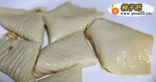 将豆皮的四周向中间折叠,馅料包裹在中间,收口处朝下压紧,按上述方法将所有的馅料和油皮全部包完;