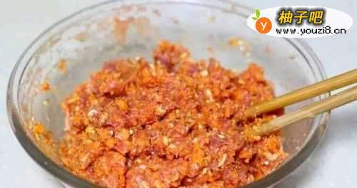 6将搅拌好的蔬菜混合物放入到拌好调味料的肉馅料中;加入少许盐搅拌均匀后再加入少许香油和1小勺食用油充分搅拌均匀;
