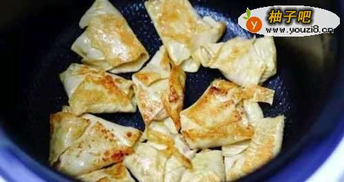 8豆皮饺子包好之后,接通多功能锅的电源,从功能菜单中选择烧烤功能,等待锅预热好之后倒入几滴食用油,放入包好的豆皮饺子慢慢煎;煎至一面金黄时,用筷子轻轻翻面,继续煎另一面;