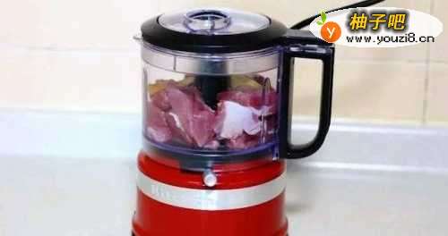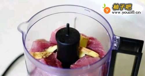 3盖上料理机的盖子,接通电源,启动搅拌功能,大约30秒左右后将猪肉和生姜搅拌成肉泥;