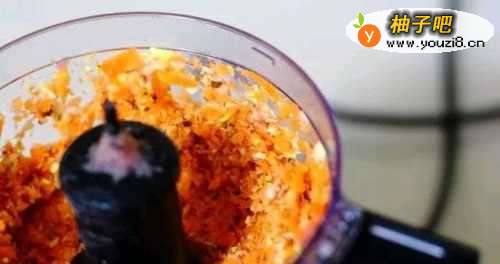 5将玉米粒、胡萝卜、香菇混合放入搅拌过猪肉的料理机中;盖上搅拌机的盖子,接通电源,按启动将玉米粒、胡萝卜和香菇混合绞碎;