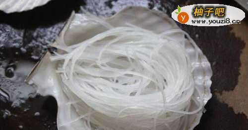 4粉丝变软后崂起沥干水,将粉丝剪短至约5-10CM长,围成鸟巢状摆在扇贝壳上