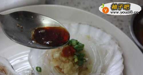 7蒜油浇在扇贝粉丝上,再点缀上少许剁辣椒