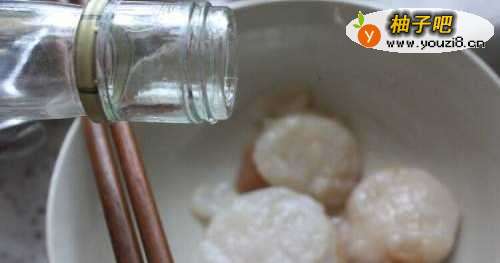 3冲洗扇贝肉,沥干后加少许白酒腌制