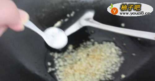 6将蒜籽去皮切成细碎颗粒,锅内倒入油,蒜籽倒入锅内爆香,再加入少许盐调味拌匀可关火