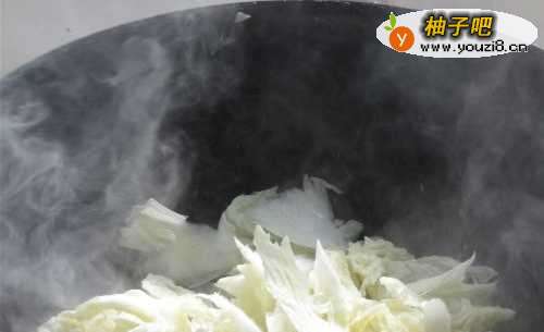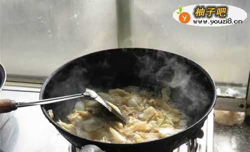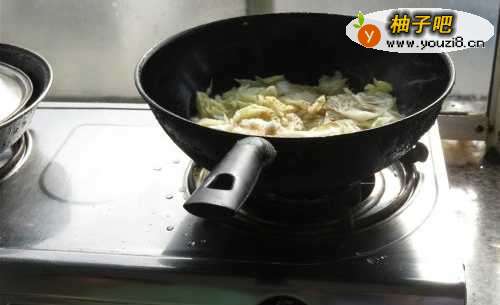 5待白菜炒软后,放入醋、糖、盐和辣椒。继续翻炒。