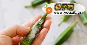 2秋葵用盐搓洗,将上面的绒毛洗去