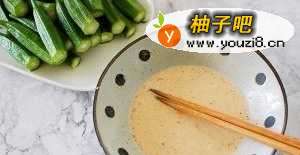 7锅中倒入适量的食用油,烧至7成热,将沾有面糊的秋葵放入锅中大火炸至表面金黄酥脆(大概需要炸制1分半钟,每家的炉子火力不一样,具体时间需要适当调整)