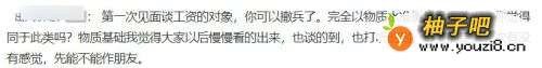 网友说:第一次见面谈工资的对象,你可以撤兵了。完全以物质水准衡量幸福的人,你觉得同于此类吗?物质基础我觉得大家以后慢慢看得出来,也谈的到,也打听的到。重要的是第一次有没有感觉,先能不能做朋友。