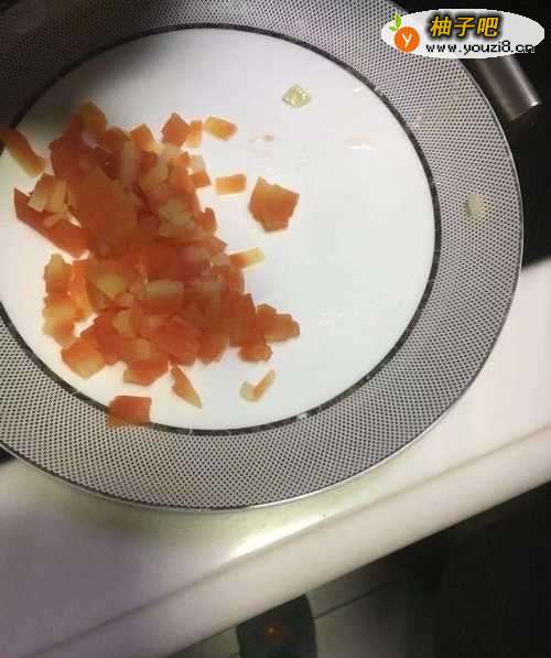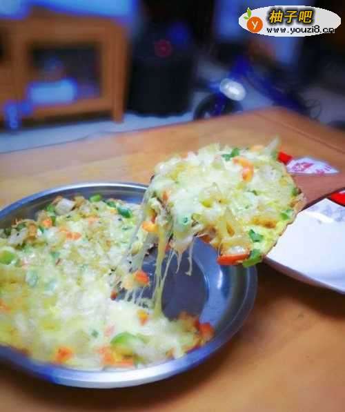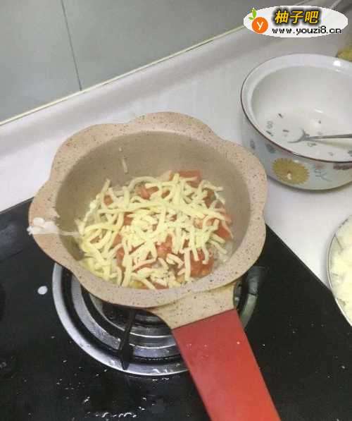 7然后把胡萝卜,肉和番茄都倒进馒头上,再把芝士放在面上