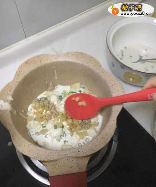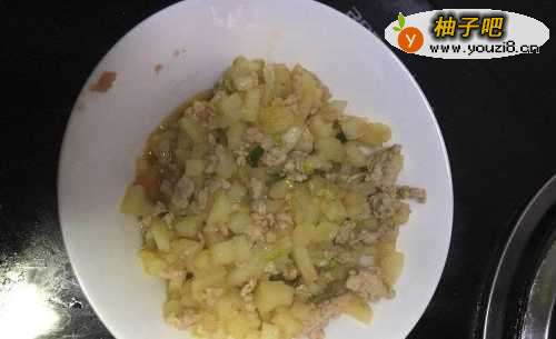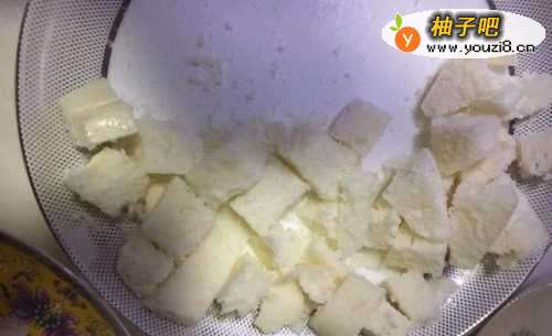 6然后在锅里倒油,锅热后就把馒头倒进翻炒几下,就可以倒调制好的面粉了。