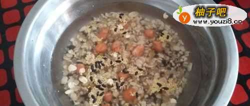 我们把食材准备好。杂粮里有黑米、薏米、小查子、小米、大米、燕麦和花生米。你喜欢什么,可以自由组合。因为经常要用到,我把所有的杂粮混在一起,装在奶粉盒子里,用时方便。