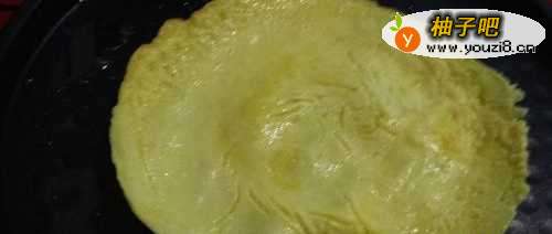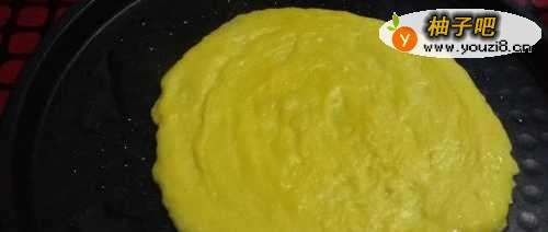 4电饼铛加热1分钟,倒入少许油,等油热了,倒入1勺鸡蛋糊。(也可用平底锅)