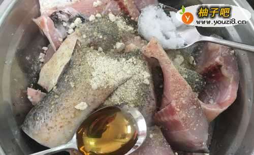 2、鱼肉剁块或者切片,用腌鱼料包和食盐、料酒腌制15分钟;