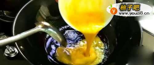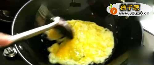 3然后用锅勺轻轻翻炒鸡蛋,期间火不要开太大以免鸡蛋膨胀跳出锅,鸡蛋要炒嫩 点炒散一点,如下图所示 。