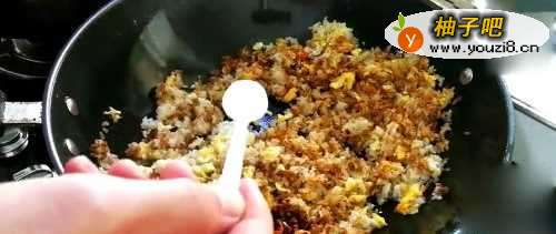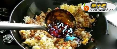 6然后加大火快速翻炒饭和鸡蛋,使他们混合均匀,然后再关小火,加入少量的酱油,如下图所示 。