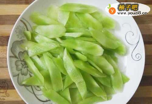 2在腌制肉的过程中,处理莴笋,先将莴笋外皮削掉,然后切成片状装入碗中备用;