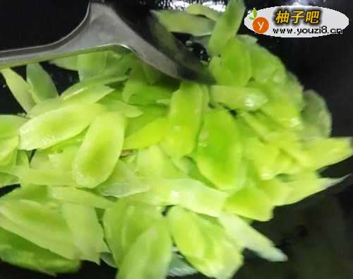 4再将莴笋倒入锅中翻炒,加入适量盐,莴笋颜色变浅后,将炒好的肉倒入混合翻炒;