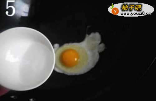 4散入半小勺盐,把锅晃一下,使油均匀,锅里撒入盐,还可以防止鸡蛋粘锅。