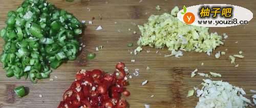 2接下分别将生姜、蒜、青椒、小米辣剁碎,备用