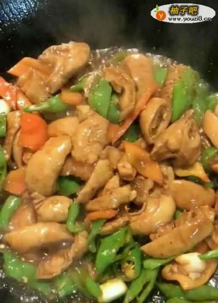 4最后,加点酱油进去提味道,加入盐,等到大肠的油变色之后,转大火进行翻炒,最好大肠的皮有一点焦的时候捞出最好吃,外面焦里面有着滑溜溜的油腻感,超级好吃。
