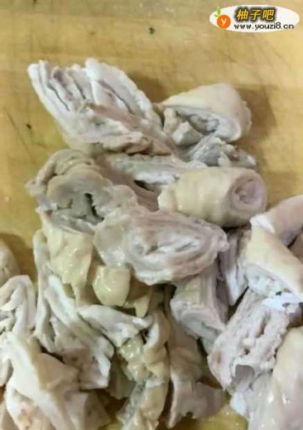 首先,我们要做的工作就是将大肠清理干净,要洗好多多遍才行,切之前洗好,切好之后再洗几遍,切成小段就行,如下图的样子。