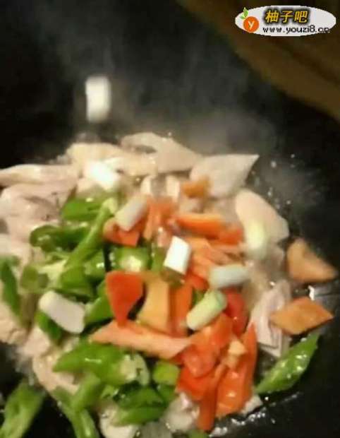 3转入大火,将大肠进行翻炒,这个时候最好是放入些青椒更好一点,之后再将葱和蒜生姜放入。