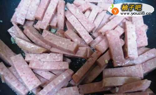 热少许油,炒香午餐肉。