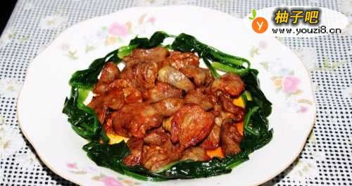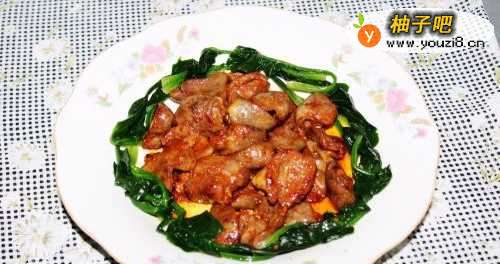 7将做好的鸡心盛入盘中,用菠菜点缀一下即可。