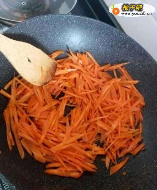 放入少许油,倒入切好的胡萝卜丝。翻炒后,撒入蒜末,接着翻炒。